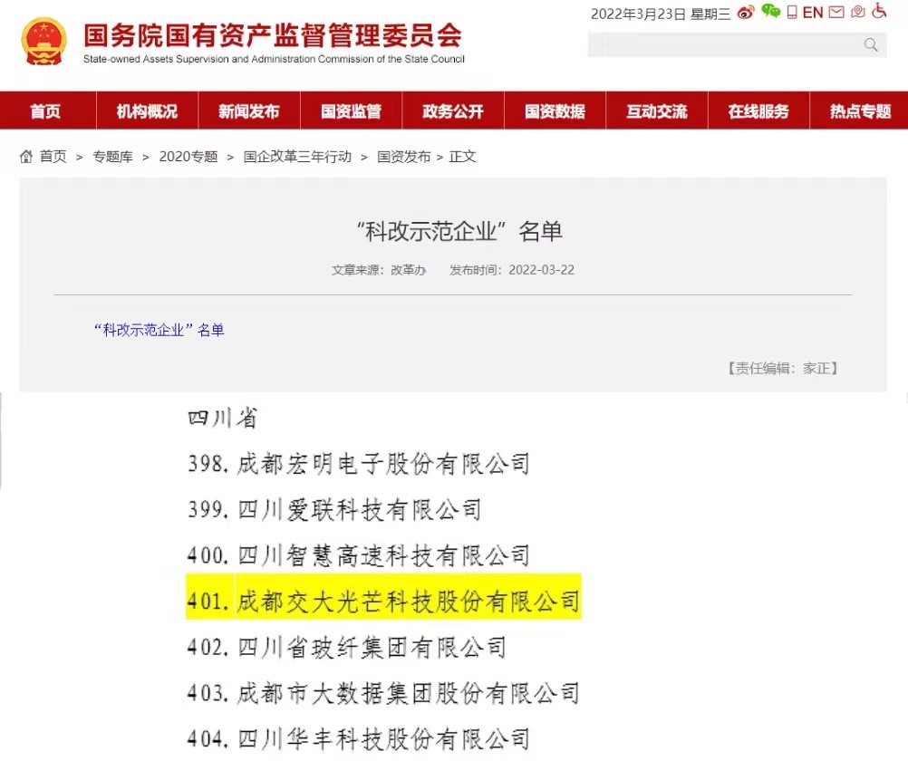 3月22日,交大光芒作为四川省七家入选企业之一,被国务院国资委纳入“科改示范行动”企业,此次“入选”,是继2021年入选四川省国资委“天府国企综合改革行动”企业的又一重大突破,也是省属科技型企业中为数不多的“双入选企业”,给公司深化改革、自主创新、跨越发展再添新活力。