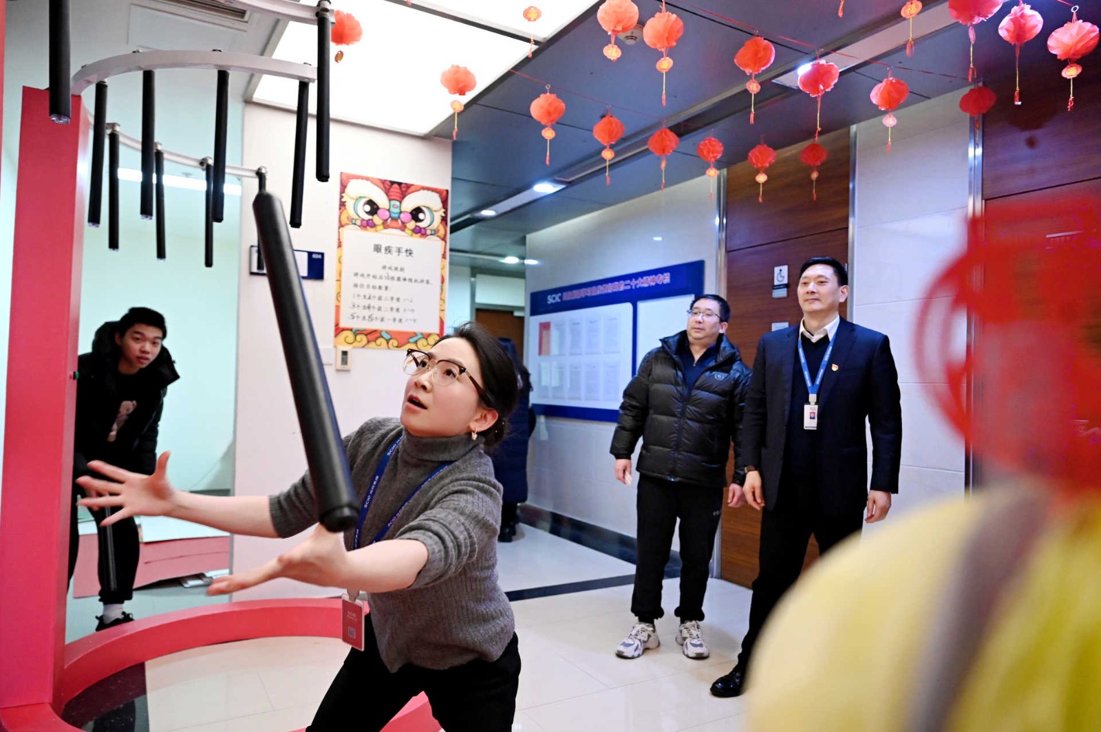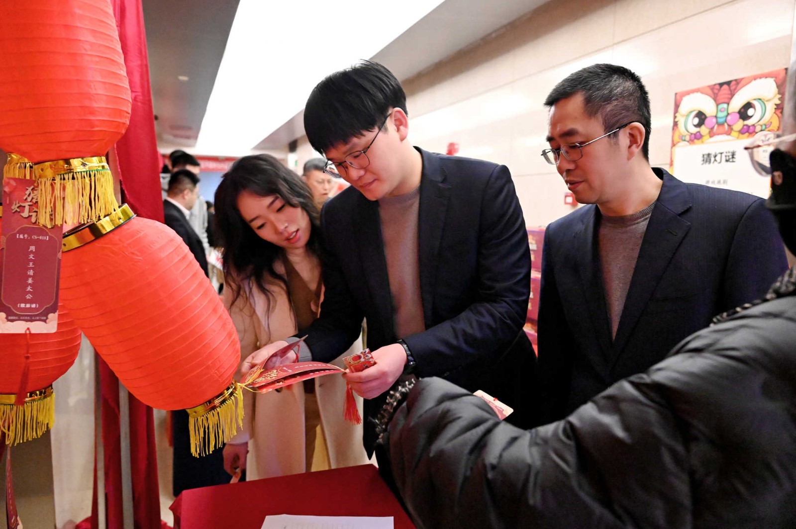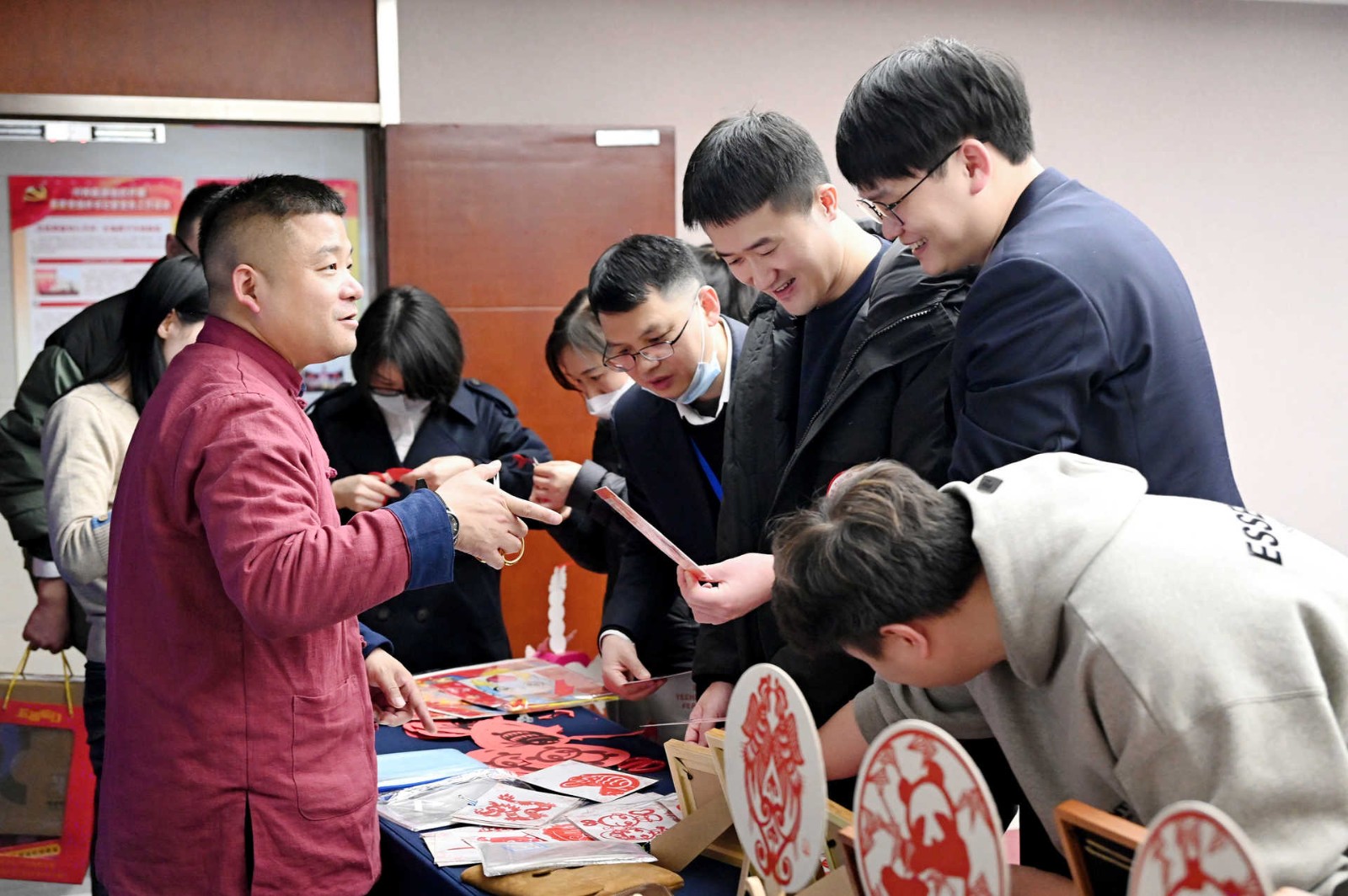此次活动采用游园方式,现场设置了民俗体验区、非遗手作区、民俗体验区、新春互动区、游戏互动区等5个活动区域,涵盖猜灯谜、剪窗花、做龙灯、滚滚乐等8个活动。活动现场每一处都用心装扮,火红的中国灯笼、精美的传统对联伴随浓郁的新年味道弥散在会场的每一个角落。大家争先恐后、玩劲十足,尽享新春的热闹与喜悦!有的围着挂着红线绳的灯谜卡片,仔细阅读谜语,认真思考,沉浸在猜谜的乐趣中;有的围在四川剪纸非遗传承人庄丛灿老师周围,一边聆听着剪纸的技巧,一边仔细修理边角,用心精雕细琢;有的在学习制作龙灯,他们展现出极高的热情和创造力,根据自己的想象,给龙灯增添了各种装饰,如彩纸、亮片等,使得每个龙灯都独具特色。