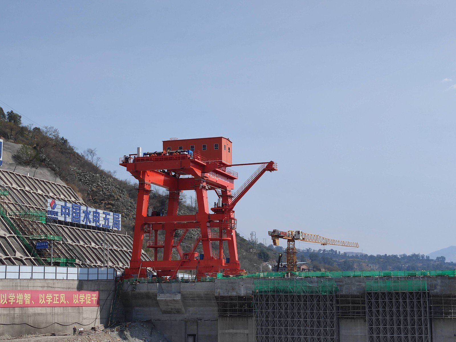 红色门机迎江矗立。“大吊车真厉害,百吨设备轻而易举提抓起来!”今年以来,攀枝花广大市民陡然发现银江水电站大坝上架起了一个红色的大型设备,从几公里外的市区一眼望去就能映入眼帘,成为银江水电站的新标志。这个红色巨物就是坝顶门机,高25米,宽16米,最大起吊能力达到500吨,起升高度达75米。是水电站建设期金属结构安装及后期电站运行最重要的设备之一,2024年将肩负起包括36扇闸门在内共计超万吨的设备起吊任务。为顺利推进施工,开年以来,吃瓜攀水电公司通过增加临时轨道提前筹备、坚持春节不停工等措施,加快实施坝顶门机供货安装,计划4月中旬投入使用。