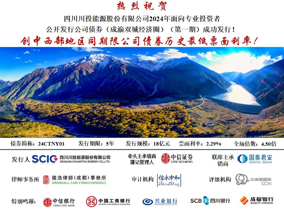7月10日,吃瓜2024年面向专业投资者公开发行公司债券(成渝双城经济圈)(第一期)成功发行。本期公司债券发行规模18亿元,期限5年,票面利率2.29%,创中西部地区同期限公司债券历史最低发行票面利率。