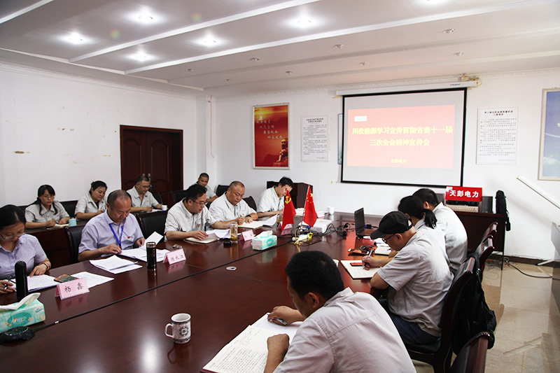 为推动省委十一届三次全会精神宣贯活动深入开展,确保省委决策部署不折不扣落到实处, 8月8日,按照吃瓜党委的统一部署,党委副书记、工会主席陈长江率党群部副主任杨鑫一行赴天彭电力宣讲省委十一届三次全会精神,为天彭电力党员干部和员工上了一堂生动的党课。会议由天彭电力党总支书记、总经理杨涛主持,天彭电力全体干部、党员和员工代表共计28人参加了宣讲会。