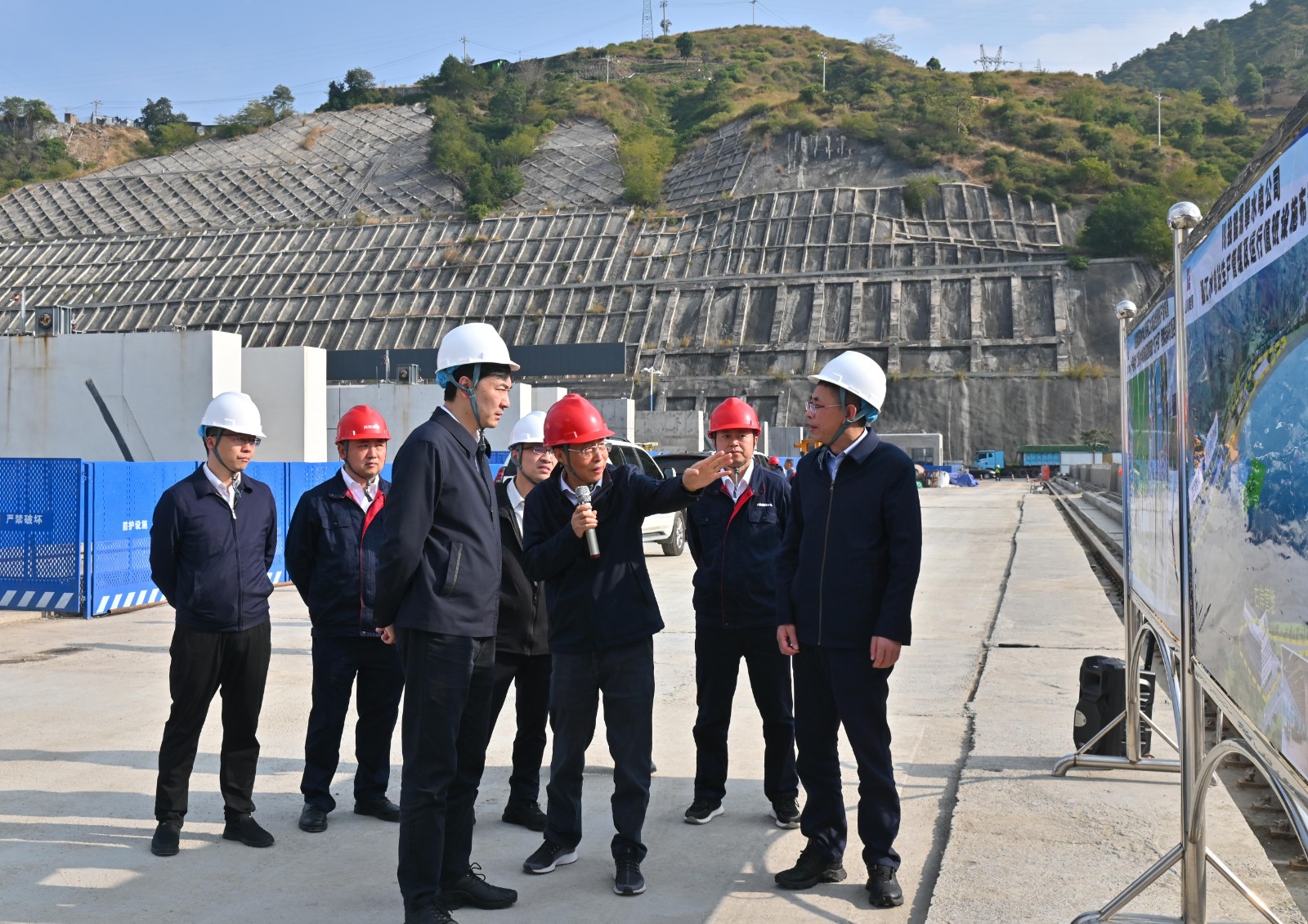 邓超一行深入银江水电站项目施工现场,实地查看了大坝坝顶、中控室、安装间等区域安全生产情况,并现场听取了攀水电公司关于工程建设、生产运行、安全环保等工作落实情况的汇报。