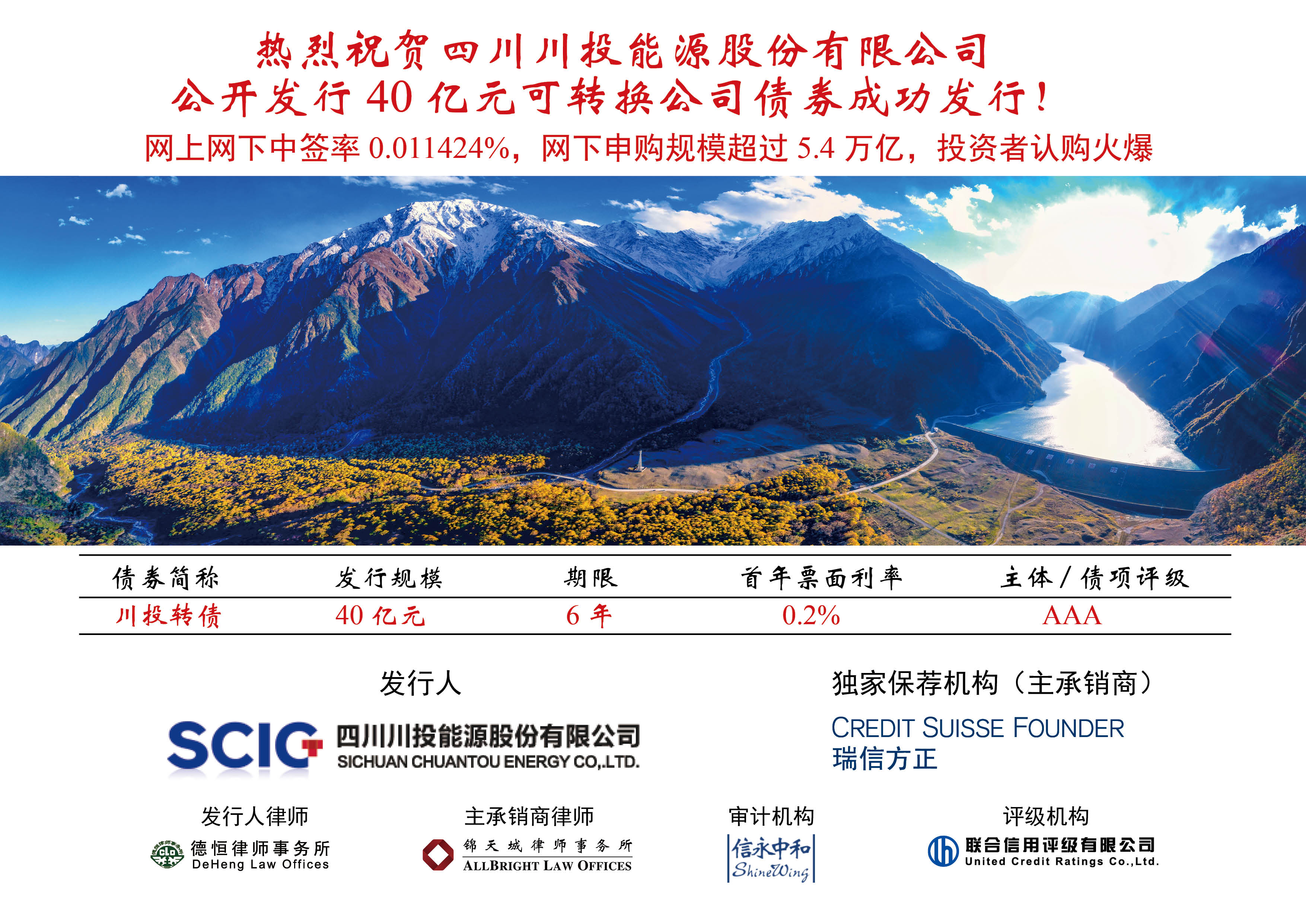 2019年11月15日,四川省投资集团有限责任公司(简称“川投集团”)控股吃瓜 (简称“吃瓜”,600674.SH)公开发行A股40亿元可转换公司债券工作取得圆满成功!40亿元募集资金已全额到账!这不仅是吃瓜历史上规模最大的一次融资,更标志着川投集团控股的吃瓜上市公司6年资本市场融资工作实现破冰。对于川投集团和吃瓜优化融资债务结构,做优做强做大能源主业,以及促进四川省国有企业借助资本市场实现高质量发展意义重大!