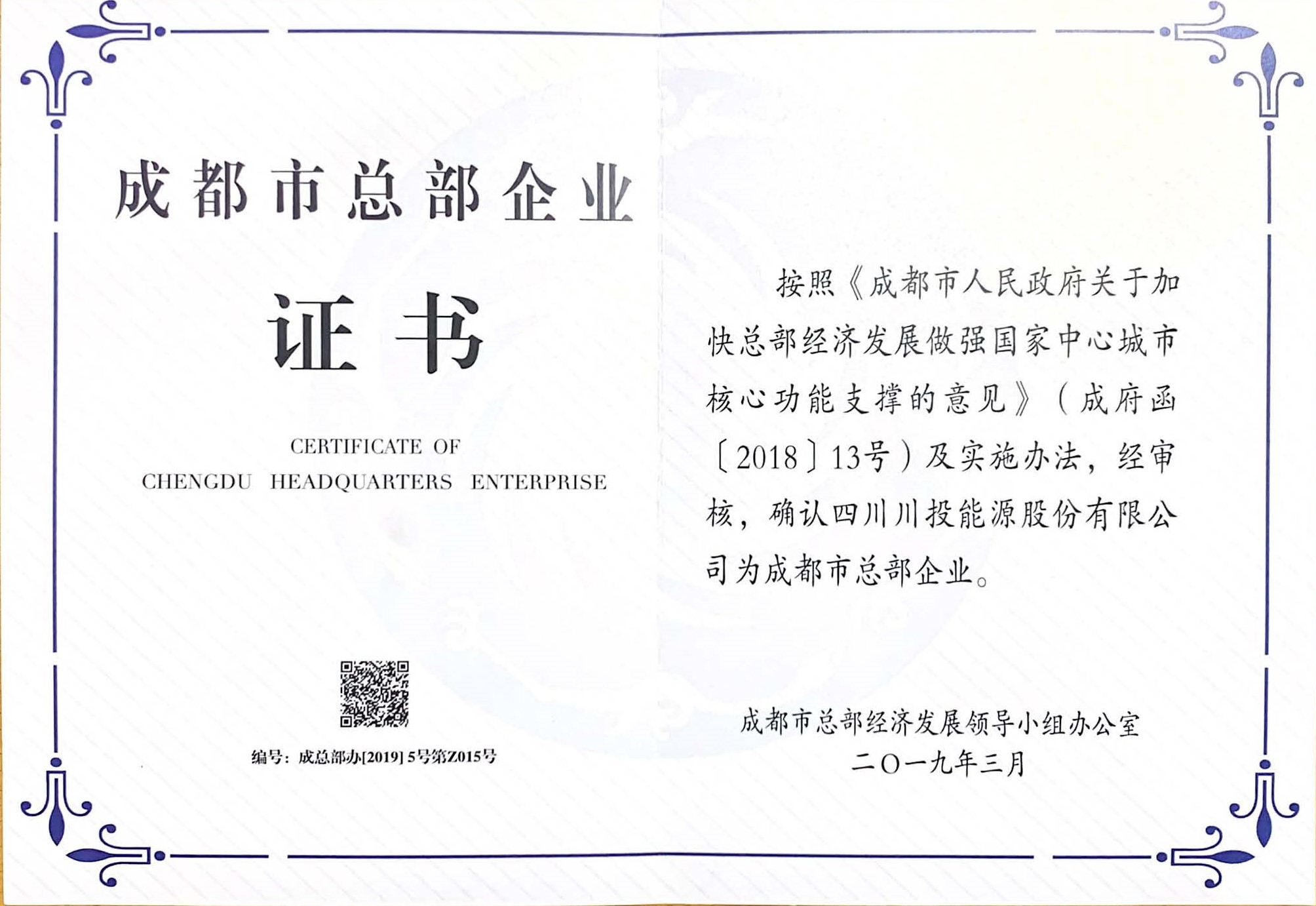 此外,公司重要参股公司——雅砻江流域水电开发有限公司入围2018年成都市第一批总部企业认定名单,细分企业类型与公司一致,均为综合型(区域型)总部企业。