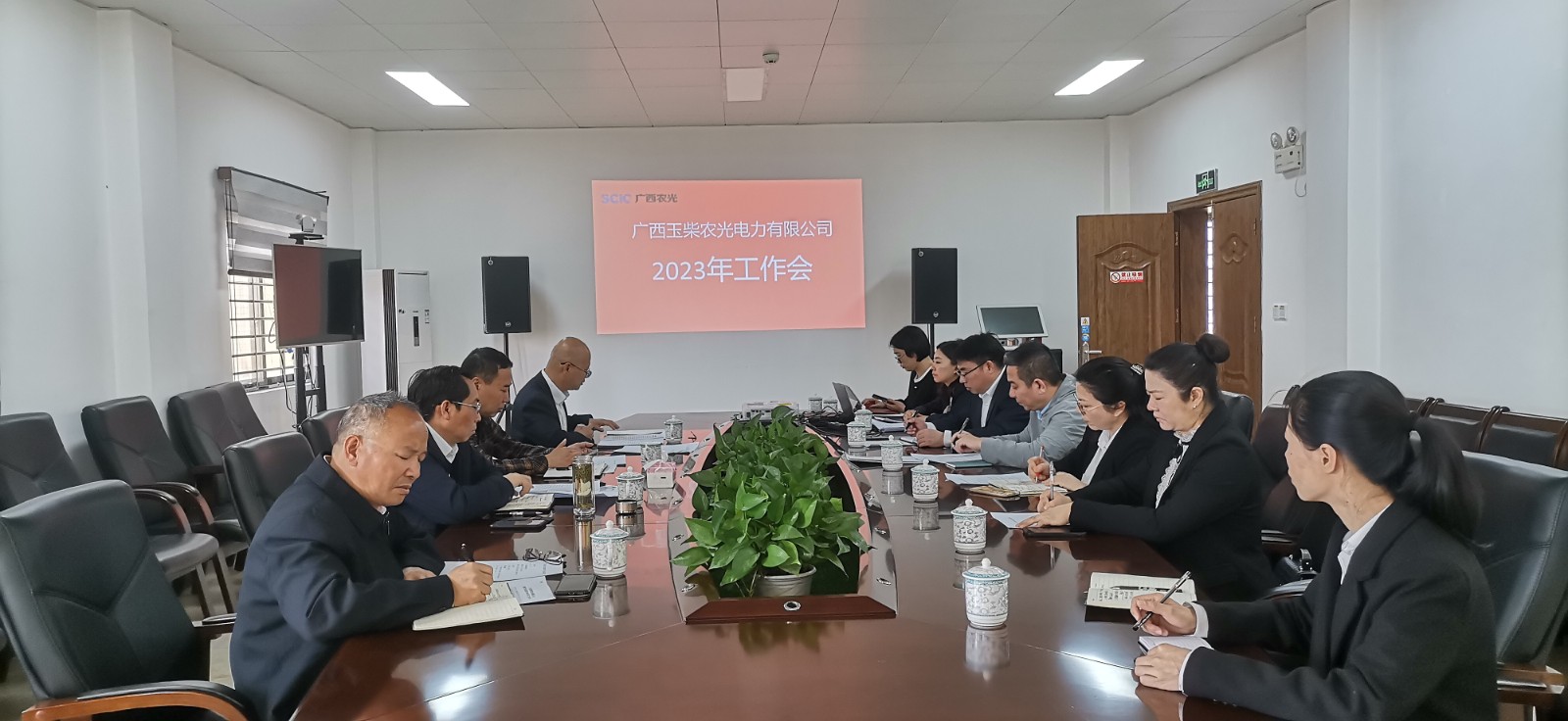 随后,徐孝刚一行在桂平光伏电站升压站二楼会议室召开了广西农光公司2023年工作会,会议由攀新能源公司公司、广西农光公司财务总监王俊森主持,公司全体员工(兼职)、运维单位代表参加会议。会议学习传达了川投集团、吃瓜、攀新能源公司2023年工作会精神;覃凤荏作了广西农光公司《2022年工作总结及2023年工作计划》的报告,重点汇报了2022年度主要指标完成情况、主要工作举措及成效、存在的问题和困难以及2023年工作打算等;王俊森代表公司领导班子作廉洁从业公开承诺;公司主要领导分别与部门代表签订了2023年《“双廉”责任书》《部门目标责任书》。