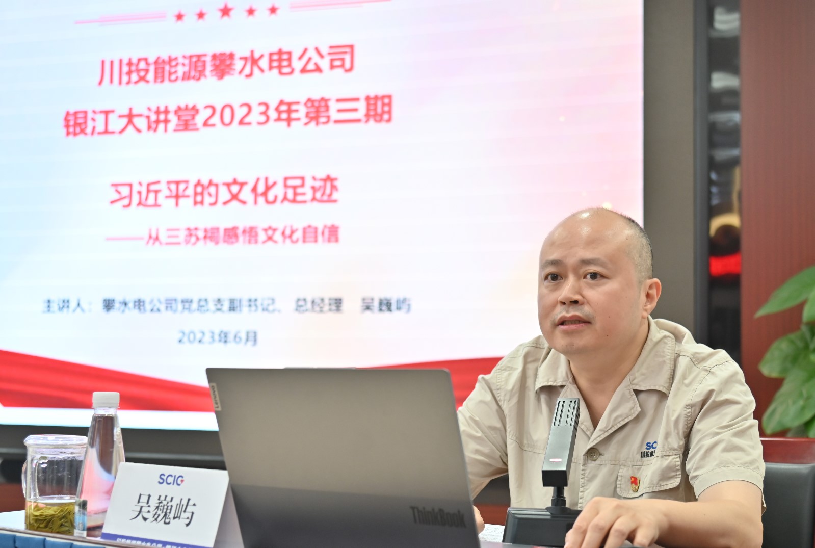 为扎实开展学习贯彻习近平新时代中国特色社会主义思想主题教育,深入学习贯彻党的二十大精神,进一步加强员工家风教育和廉洁教育,推动主题教育走深走实,6月29日,攀水电公司党总支副书记、总经理吴巍屿以《习近平的文化足迹——从三苏祠感悟文化自信》为题,讲授中华优秀传统文化教育党课,公司在攀领导、各参建单位主要负责人、公司全体员工及各参建单位党员代表共50余人参加。