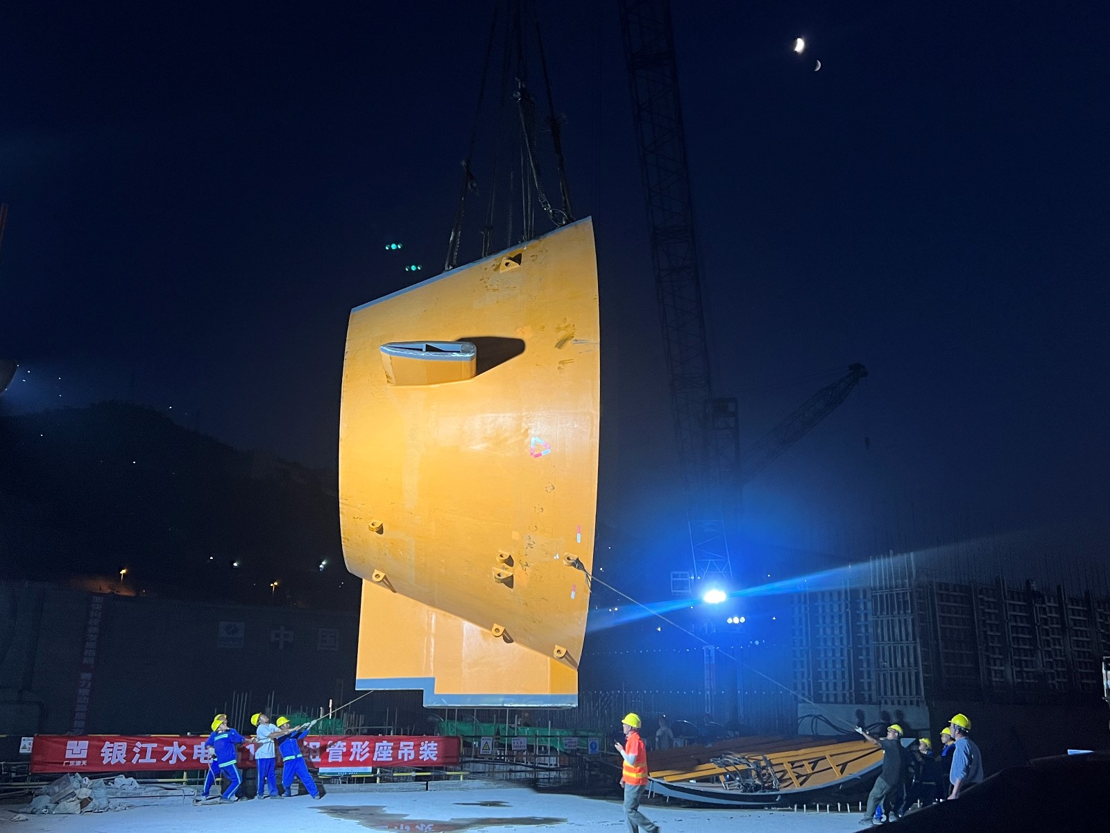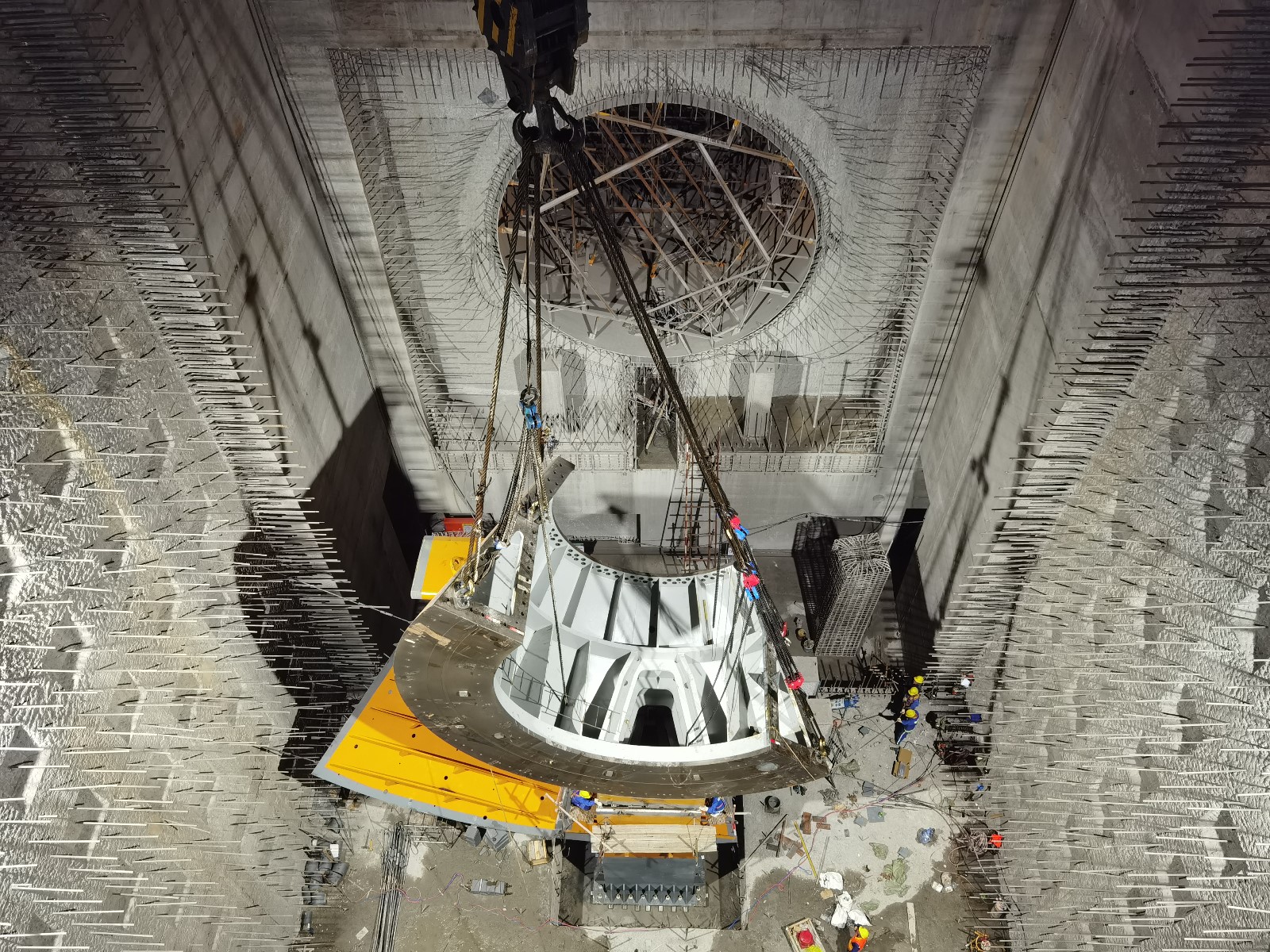 10月20日履带吊车试吊验收及下固定导叶顺利吊装完成后,从20日16点开始至21日20:00结束,历经运输、翻身及吊装三个阶段长达18个小时工作,管形座最重件第一瓣内壳在公司领导的现场指导下稳稳落至安装位置,后续公司将组织参建单位一鼓作气将首台机组管形座剩余内壳、外壳、前锥体及固定导叶等悉数吊装到位,力争年底完成安装工作,为实现2025年一季度首台机组投产发电目标打下坚实基础。