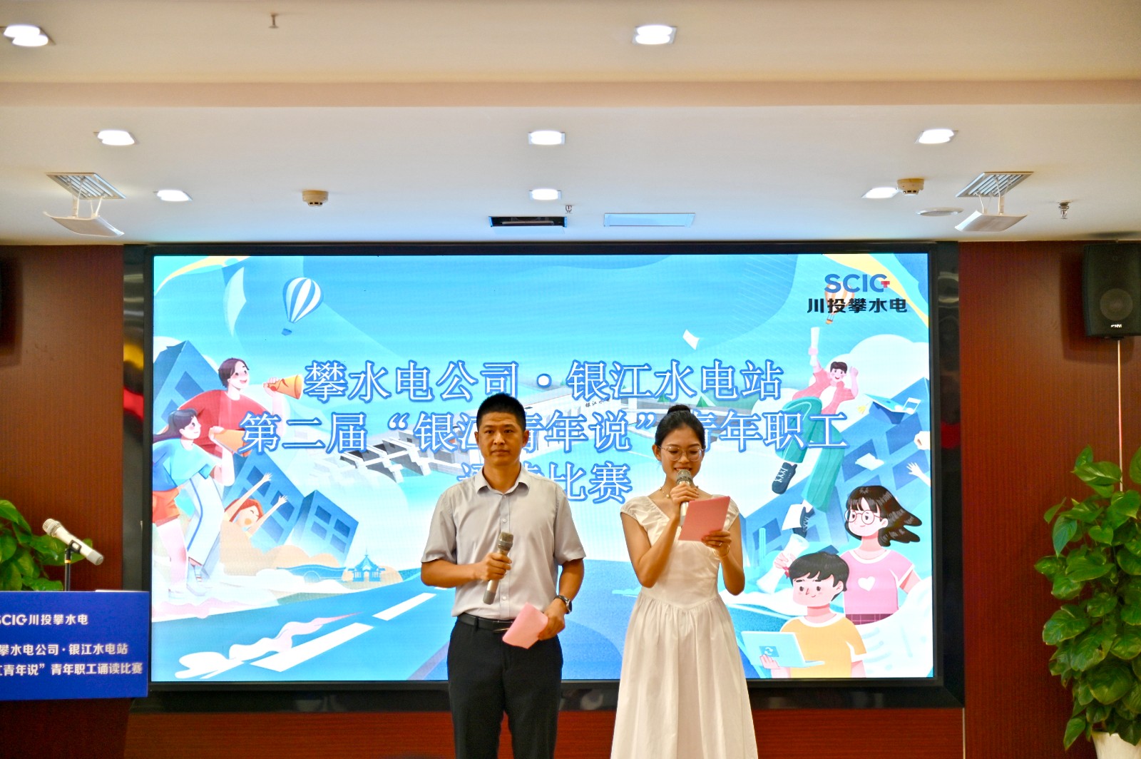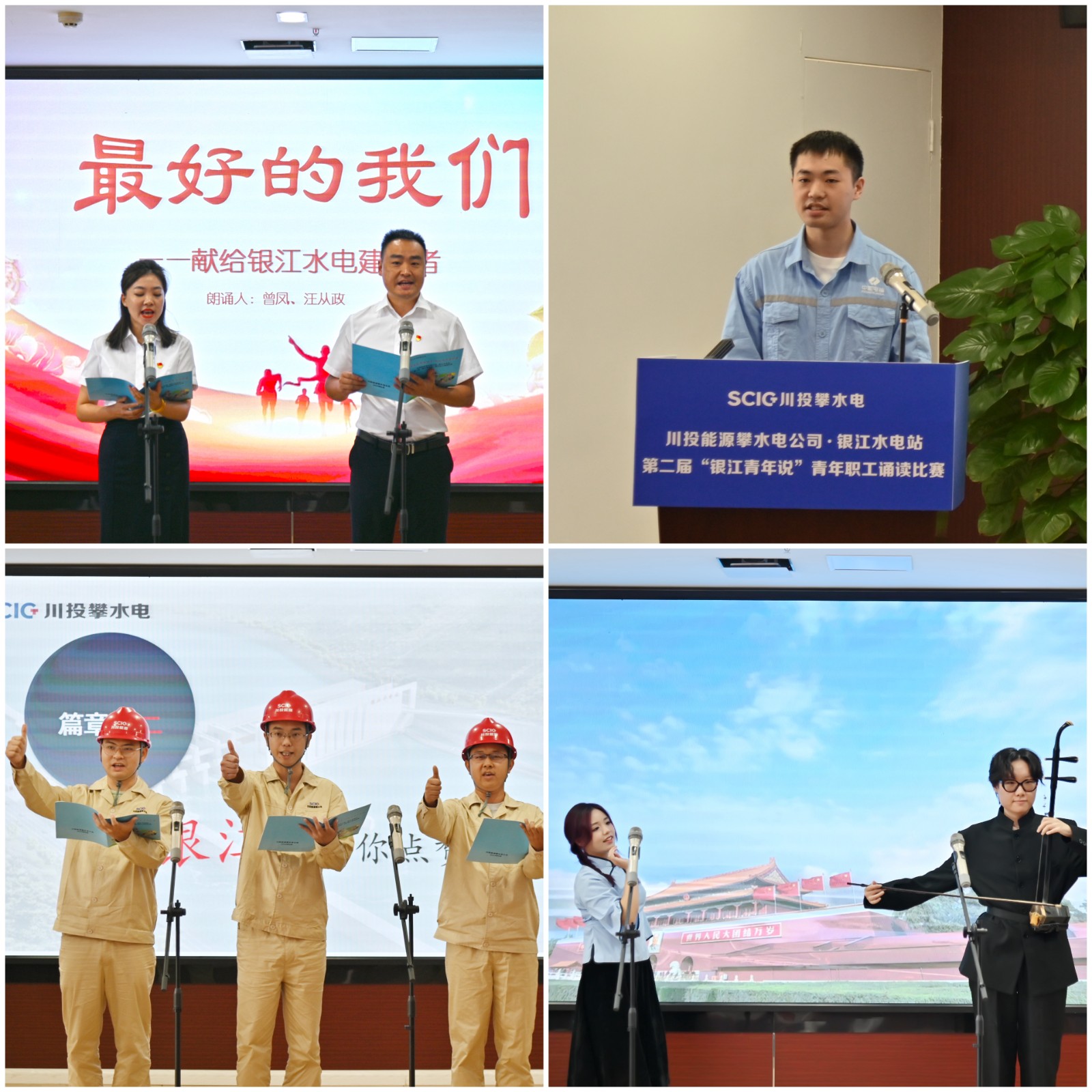 本次比赛以“蓄水发电加油干,银江青年显担当”为主题,来自公司及参建单位的10组14名选手结合各自的工作岗位精心创作了诵读作品,他们中有刚退伍的发电部新兵,有刚毕业的财务新手,还有久经沙场的一线职工,不同岗位、各色服饰、创意满满、精彩纷呈。来自水电五局项目部的黄山珊、扈文博身穿中国风服装,手拿传统乐器二胡,以优美的舞姿和深情的诵读,回顾了历史长河的中热血青年,赞美了日夜奋战在施工一线的银江青年,充分展现了当代青年的文化自信,勇夺比赛第一名;平日里不善言辞、埋头苦干的工程小伙也勇敢站上讲台,致敬了他们心中“年轻的战场”,以一段充满激情的歌声瞬间把现场气氛点燃;还有发电部新入职的小姑娘,外表文静的她却有着极强的爆发力,让大家刮目相看。