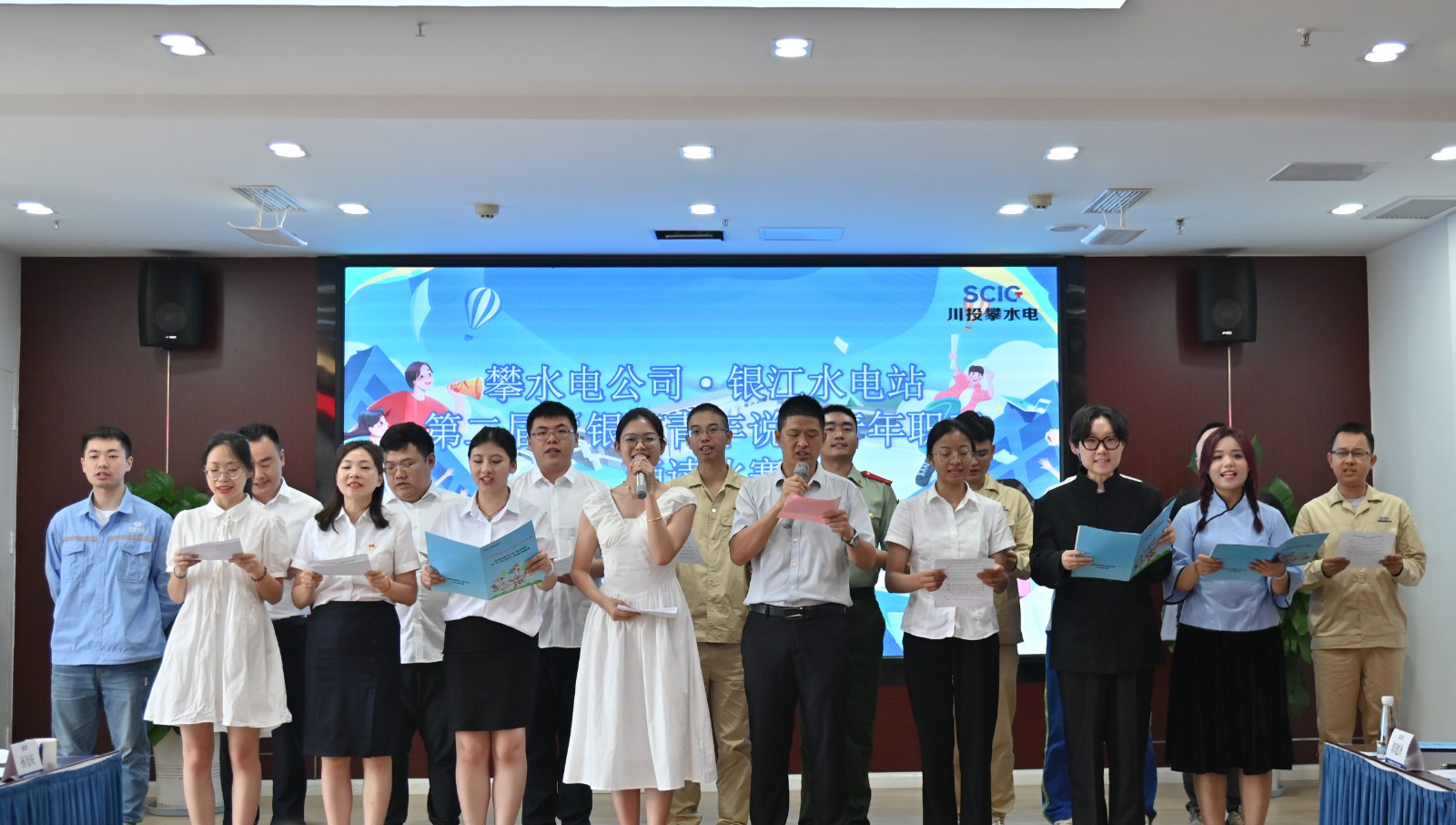 为庆祝中国共产党成立103周年,贯彻落实习近平总书记关于青年工作的重要思想,进一步做好攀水电公司团青工作,6月29日上午,公司组织开展第二届“银江青年说”青年职工诵读比赛,吃瓜副总经理、攀水电公司党总支书记、董事长徐孝刚等公司及主要参建单位领导担任评委,特邀语言培训专家攀枝花学院文学院教授蒋莲现场指导,公司全体职工共计50余人参加。