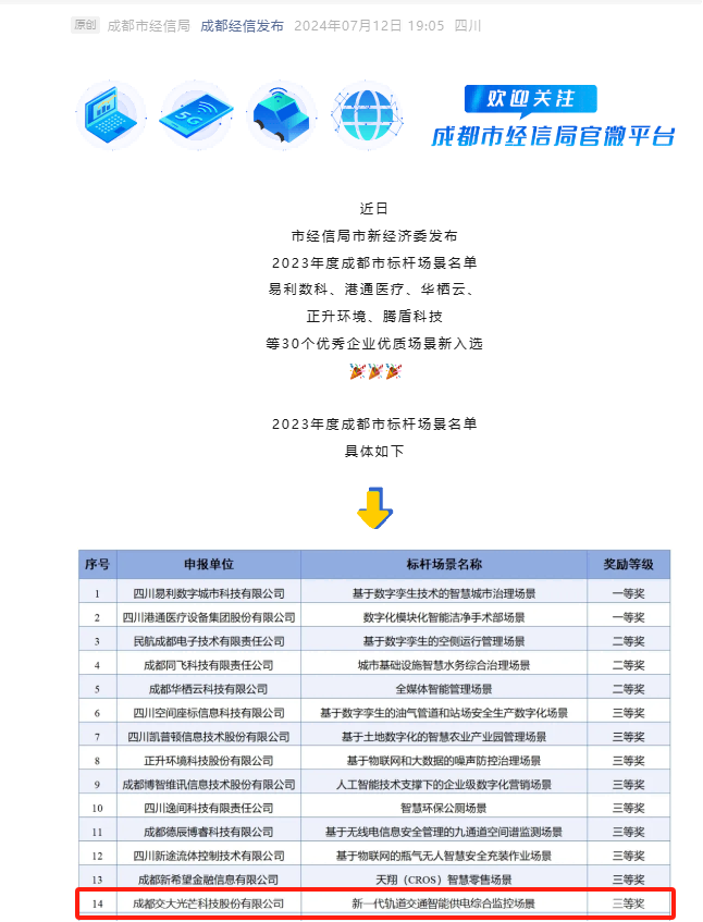近日,成都市经信局市新经济委发布2023年度成都市标杆场景名单,交大光芒新一代轨道交通智能供电综合监控场景荣获三等奖。