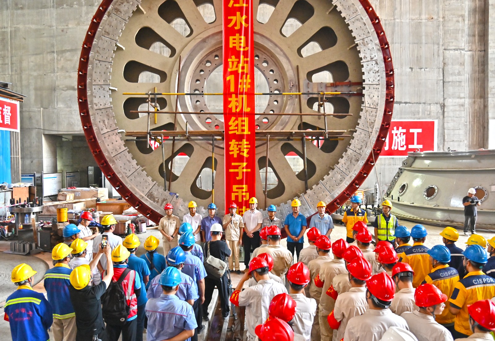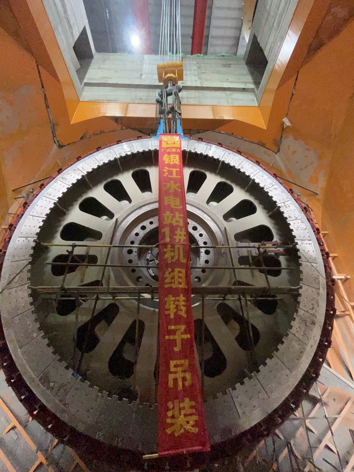 发电机转子是水轮发电机组的“心脏”,是整个机组安装过程中最后一个核心转动部件,银江水电站1号机转子挂装磁极后整体直径8.47米,净重230吨,起吊重量达238吨,主要由磁轭一体式转子支架、磁极、制动闸板等部件组成,在经过23道组装工序后,完成了转子圆度调整、绝缘电阻检测、耐压试验、静平衡试验等各项检查验收,满足国家水轮发电机组安装技术规范要求。为保证转子吊装的安全和精确度,转子吊装前,公司组织各参建单位对专项吊装方案进行了审查,严格安全技术交底和现场检查,逐项落实吊装措施和职责,确保了1号机组转子顺利完成吊装。