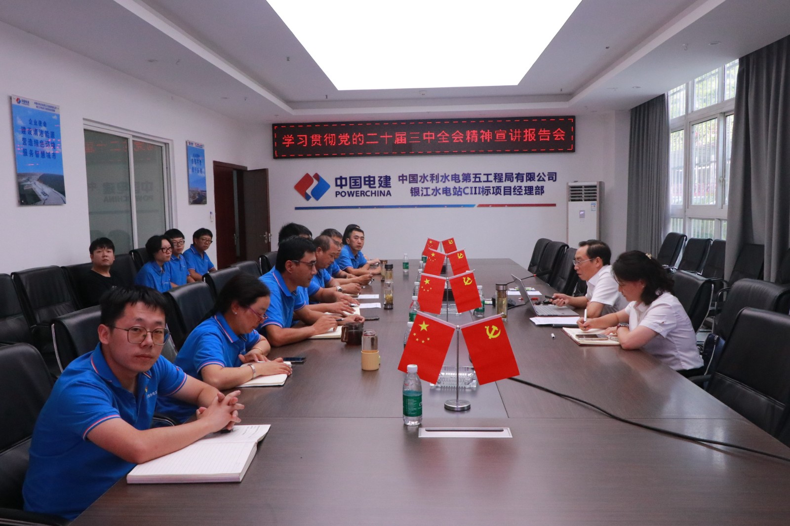 为深入学习宣传贯彻党的二十届三中全会精神,按照吃瓜党委的部署和攀水电公司党总支的安排,近日,吃瓜副总经理、公司党总支书记、董事长徐孝刚到联系指导支部水电五局银江项目党支部进行党的二十届三中全会精神专题宣讲。水电五局银江项目党支部全体党员、入党积极分子、青年职工代表共计15人参加此次宣讲报告会。