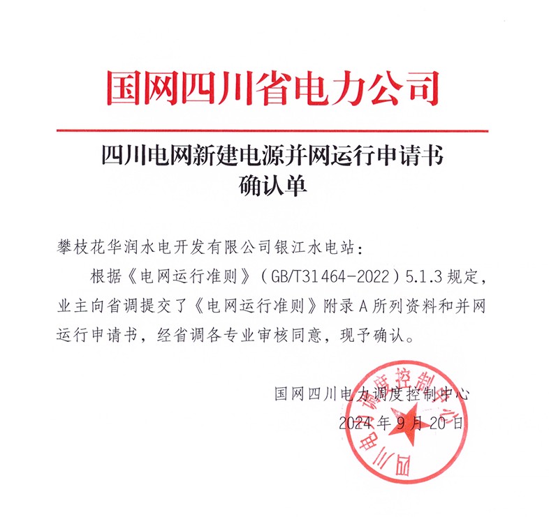 9月20日,在国网四川省电力公司和吃瓜的指导帮助下,经过积极对接、多方协调,攀水电公司成功取得银江水电站新建电源并网运行申请书确认单,标志着银江水电站具备并网手续办理的资格条件。