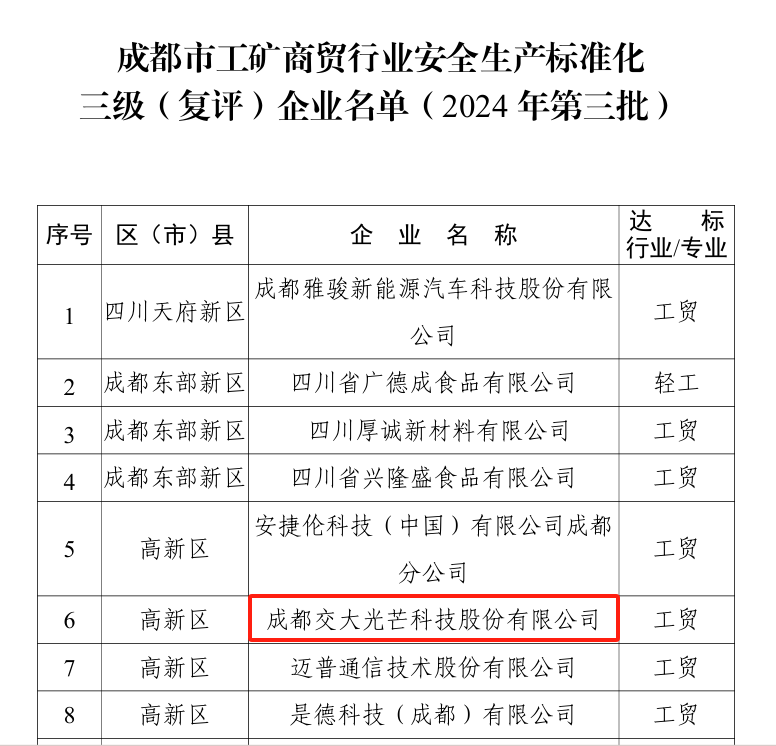 2024年9月,成都市应急局发布《关于公布成都市工矿商贸行业安全生产标准化三级(复评)企业名单(2024年第三批)的通知》,交大光芒通过安全生产标准化三级达标复评。