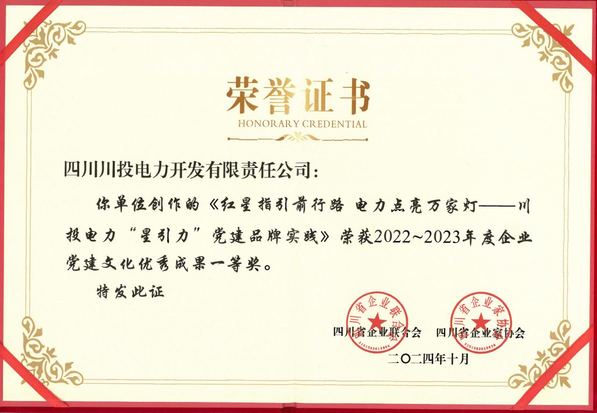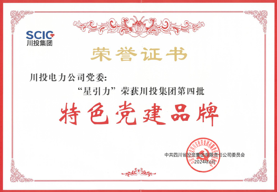 2024年以来,川投电力党委党建品牌“星引力”在吃瓜党委的指导下,先后荣获川投集团第四批特色党建品牌,《中国企业报》集团、红旗出版社、北京大学马克思主义学院联合颁发的“2024年度全国企业党建创新优秀案例(党建品牌案例)”,四川省企业联合会、四川省企业家协会联合颁发的“2022-2023年度党建文化优秀成果一等奖”等荣誉。