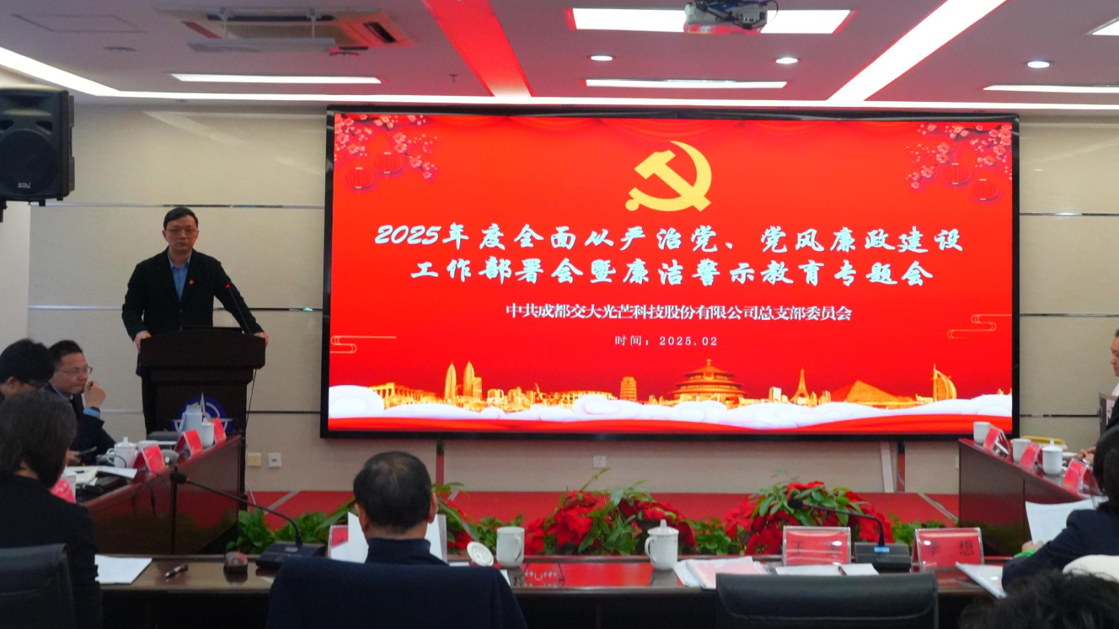 为深入学习贯彻二十届中纪委四次全会精神,深入推进公司党风廉政建设和反腐败工作,2月21日,交大光芒党总支召开2025年度全面从严治党、党风廉政建设工作部署会暨廉洁警示教育大会,党总支书记、常务副总经理王涛主持会议,公司领导班子成员、主管及以上管理人员、党员参加会议。