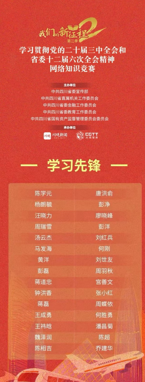 近日,由中共四川省委宣传部、省委省直机关工委、省委金融工委、省委教育工委、省国资委党委联合主办,四川日报报业集团承办的“我们的新征程”(第二季)网络知识竞赛公布了获奖名单,并为获奖人员发放奖牌,川投电力所属天彭电力11名员工凭借扎实的理论功底和锲而不舍的努力,从全省32万余名参与竞赛的党员群众中脱颖而出,进入全省个人排行榜前30名,荣获“学习先锋”称号。