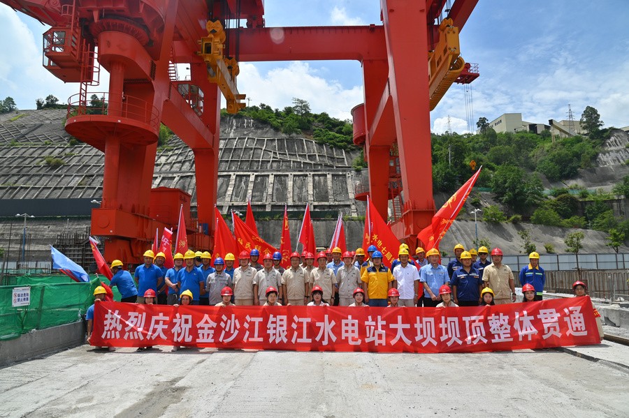 银江水电站坝段工程结构复杂且布局有序,从左至右依次分布着左岸公路坝段、鱼道坝段、安装场坝段、机组坝段、河床溢流坝段、纵向围堰坝段、右岸溢流坝段和右岸非溢流坝段,坝顶全长386.75米,最大坝高73米,坝顶高程1008米。大坝的建设历时2年零8个月,2022年11月5日主体工程首仓混凝土开工浇筑,于2025年5月31日浇筑到顶,累计完成混凝土浇筑总量87万立方米。在工程施工过程中,所属攀水电公司与各参建单位一道,克服重重困难,构建起强有力的技术、管理、资源保障体系,推动工程建设各个关键节点目标均较计划提前完成。