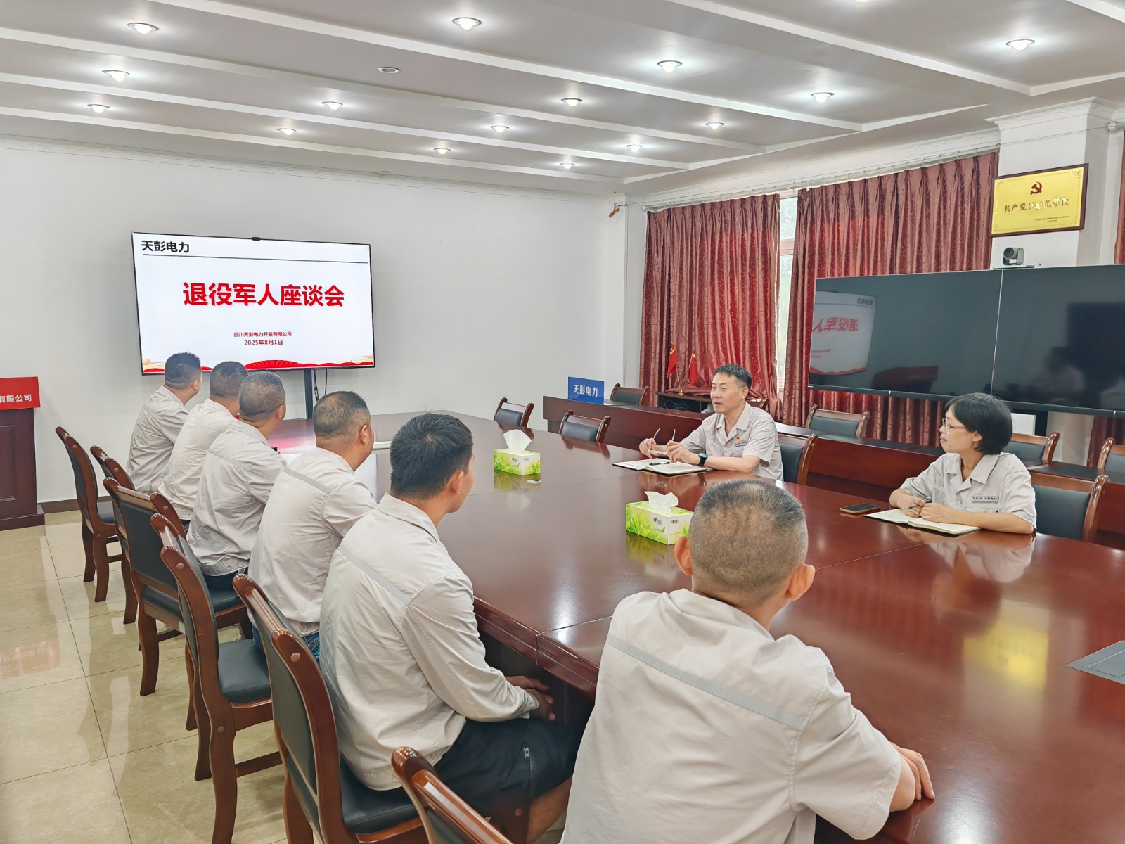 各所属单位结合实际情况开展了“八一”建军节走访慰问活动。天彭电力公司、百花滩电厂召开退役军人座谈会,高奉山电厂开展“八一”建军节主题党日活动,槽渔滩公司组织观看爱国主义教育电影《南京照相馆》,为退役军人送上节日祝福和慰问。所属单位认真学习贯彻习近平总书记对双拥工作的重要指示精神,重点了解退役军人当前工作与生活面临的困难。退役军人职工代表结合自身经历,分享了在部队期间的成长经历和难忘回忆,并表示永葆军人本色,做到“退役不褪色,转岗不转志”,不断提升业务能力和水平,发挥模范带头作用,以更高的水准应对工作中各种挑战和机遇。当前正值迎峰度夏保供电关键期,号召全体退役军人职工继续发扬“特别能吃苦、特别能战斗”的作风,在保电保供攻坚战中当先锋、打头阵,以实际行动践行水电人的初心和“退役不褪色”的庄严承诺。