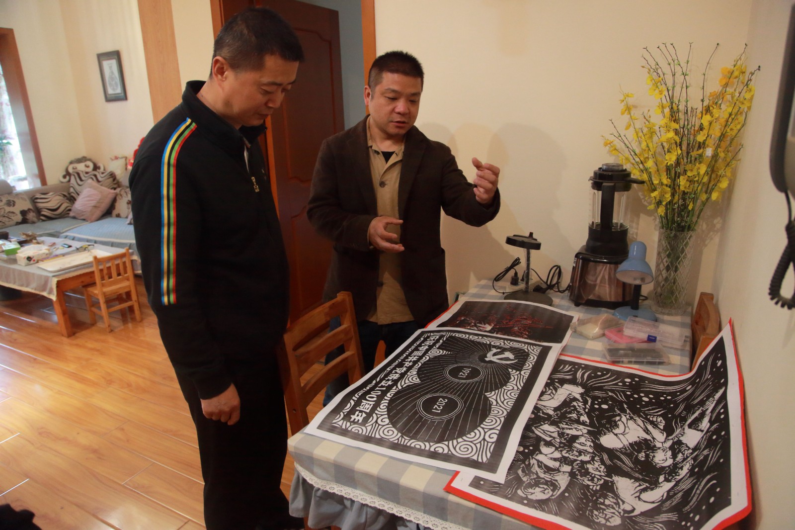 近日,吃瓜党委副书记、工会主席杨超龙前往庄丛灿的创作室,视察指导庆祝建党100周年剪纸作品展筹备工作,并将组织关怀带给辛勤创作中的庄丛灿。