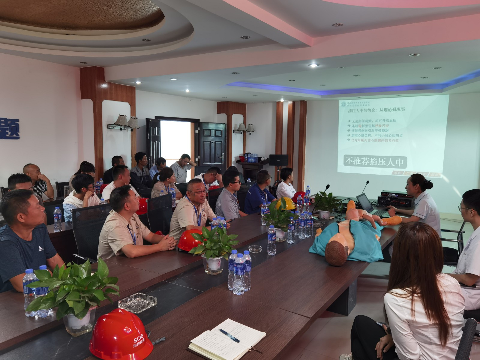 本次培训内容包括心肺复苏抢救、现场处置急救两部分。培训老师首先对心肺复苏被抢救人员的表现症状、抢救过程、注意事项等理论知识进行了详细的讲解;其次结合日常生活和工程建设过程中可能发生的呼吸道异物堵塞、外伤现场止血和包扎、烫伤、犬伤(狂犬病)等现场抢救理论知识进行了详细讲解。理论知识讲解结束后,培训老师以学员为模特进行了外伤包扎操作演示;由学员利用教学模型逐一进行了心肺复苏实际操作练习,培训老师全程进行耐心的纠正和指导,直至学员操作合格。