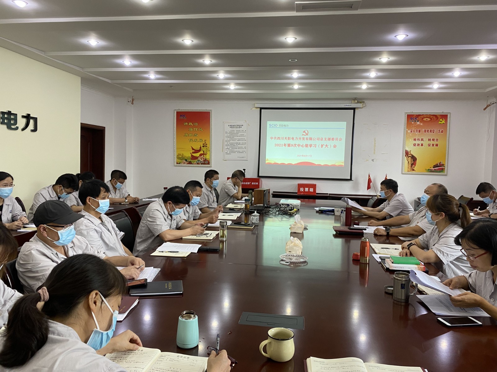 8月17日上午,天彭电力党总支在公司二楼会议室召开2021年第9次中心组学习(扩大)会,公司领导、党员干部、关键岗位人员参加会议,会议由公司党总支书记、总经理陈忠主持。