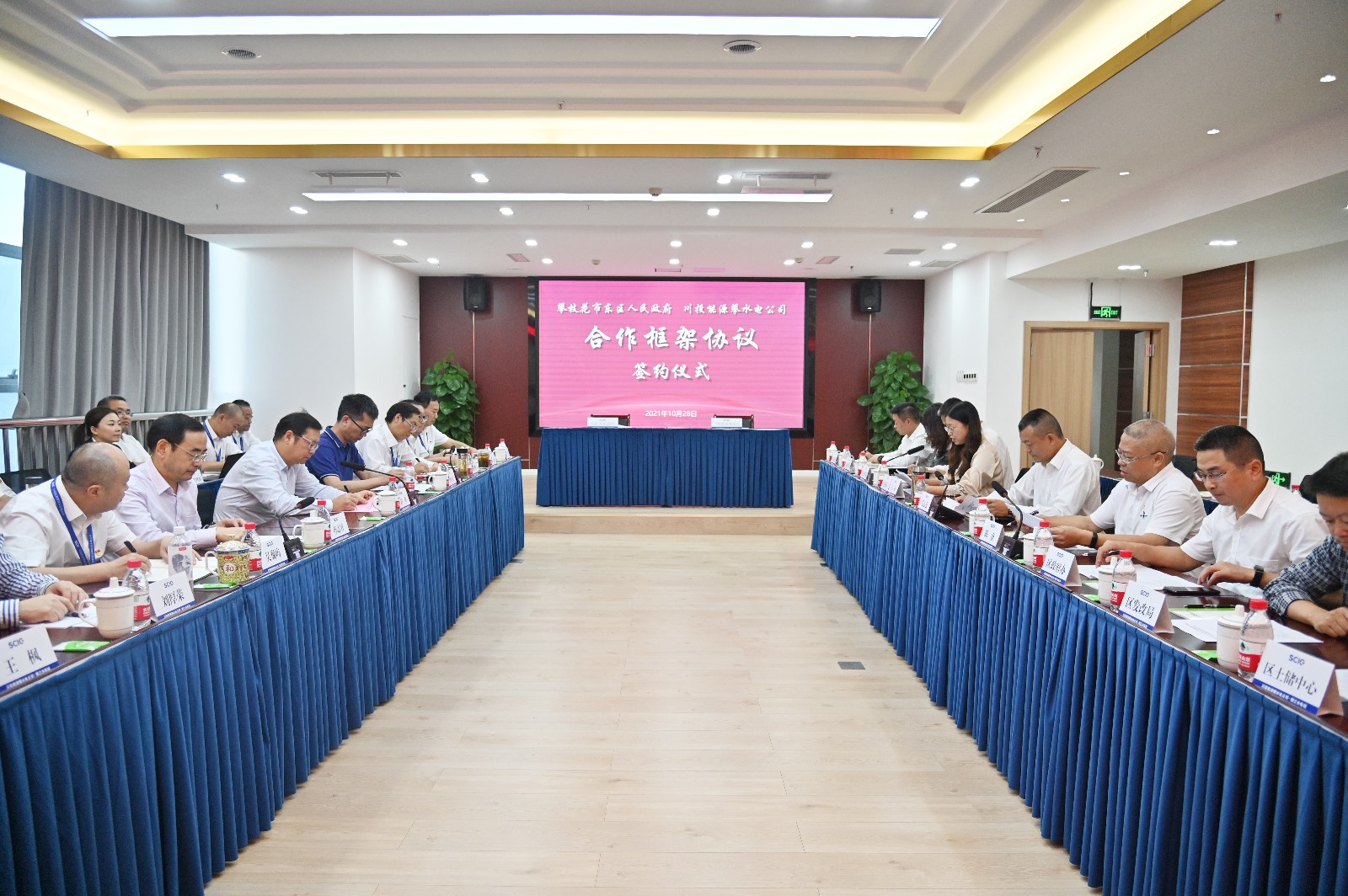 10月28日下午,攀枝花市东区人民政府与吃瓜攀水电公司《合作框架协议》签约仪式在钢城经贸大厦举行。东区区委副书记、代理区长毛志强、东区人大常委会党组副书记陈康,川投集团党委委员、副总经理舒勇,总经理助理、经营管理部部长李胜章,专职外派董监事孙志祥,吃瓜副总经理、攀水电公司党总支书记、董事长徐孝刚出席签约仪式,仪式由东区政府副区长人选王静主持。