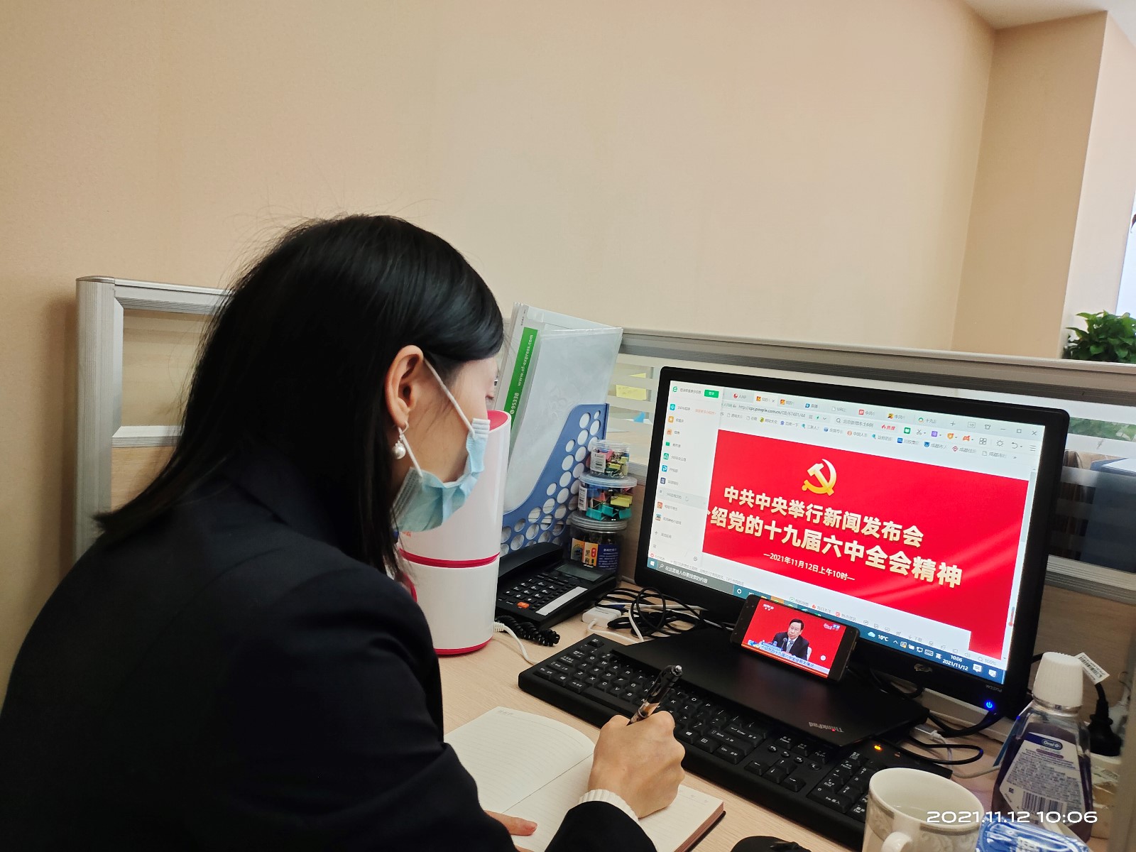 通过观看发布会,全体党员职工深刻认识到,确立习近平同志党中央的核心、全党的核心地位,确立习近平新时代中国特色社会主义思想的指导地位,对新时代党和国家事业发展、对推进中华民族伟大复兴历史进程具有决定性意义。在建党百年之际,党中央召开六中全会,全面总结党的百年奋斗重大成就和历史经验,是郑重的历史性、战略性决策,体现了我们党重视和善于运用历史规律的高度政治自觉,体现了我们党牢记初心使命、继往开来的自信和担当。