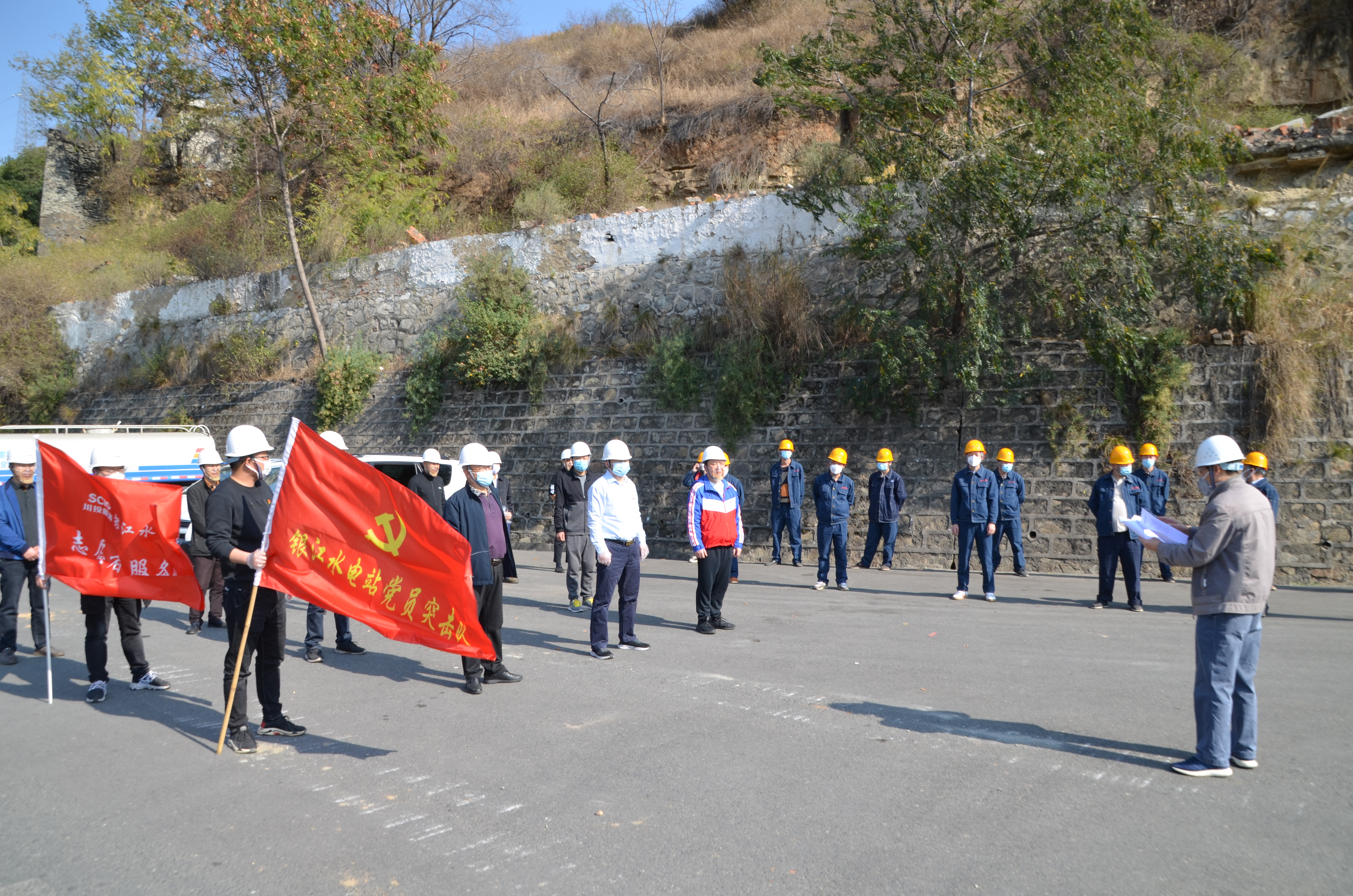 活动现场举行了“党员突击队”和“志愿服务队”授旗仪式,旨在进一步发挥党总支在疫情防控和工程建设中的战斗堡垒作用,不断激发党员的先锋模范作用和弘扬志愿者“奉献、友爱、互助、进步”的宝贵精神。“面对疫情绝不退缩,面对困难冲锋在前………”的庄严承诺响彻江水,“战疫情、防风险、保安全、推进度”的工作要求印刻心间,同志们一张张坚毅有力的脸庞上无不透露着坚定信心、迎难而上、勇于奉献、敢于担当、不怕牺牲、忠诚履职的奋斗气息和乐观精神。授旗仪式后,党员突击队和志愿服务队全体同志们齐心协力清理了新建214省道江边临时改线路上的水马、路障和杂物,用实际行动为省道临时改线路提前顺利通车创造了有利条件。大家纷纷表示将以本次主题党日活动为契机,提高政治站位,采取有力措施,以更加饱满的斗志和昂扬进取的态度投身到后续各项任务当中,在川投集团和吃瓜的统一带领下,坚决打赢疫情防控阻击战和复工复产攻坚战,全力以赴完成银江水电站年度目标任务。