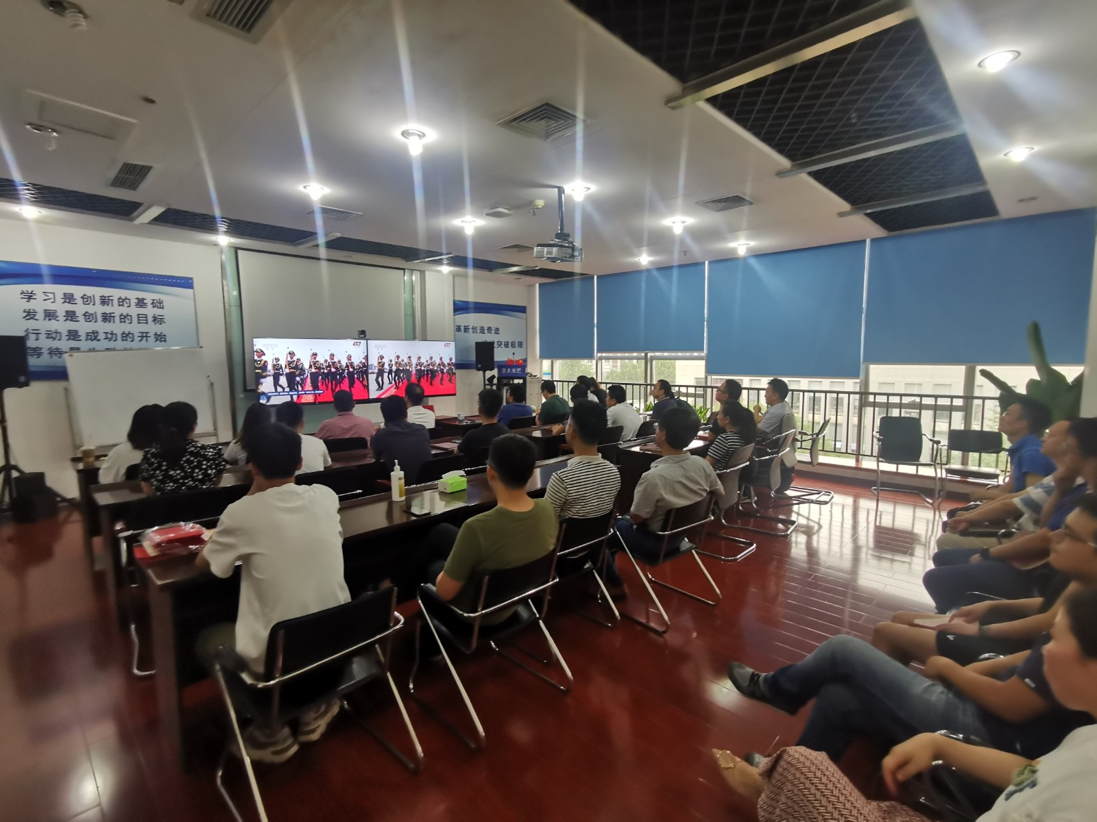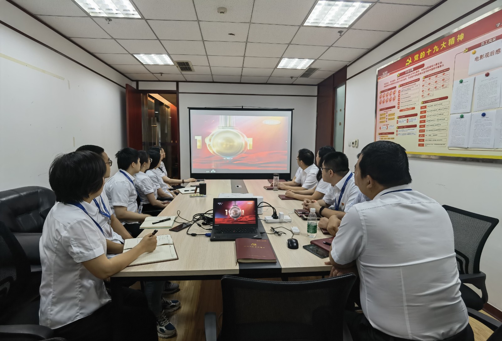 视频中,习近平总书记铿锵有力的声音深入人心,从1921到2021,中国共产党带领中国人民,从风雨飘摇中一路走来,百年征程波澜壮阔,百年初心历久弥坚。当《国歌》《国际歌》相继响起的时刻,会场人员纷纷起立,跟随激昂的旋律整齐高唱。当回顾“四史”赞颂党的伟业之时,会场人员满溢出对党的感恩和身为党员的自豪。